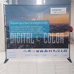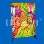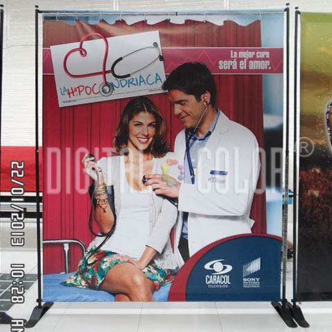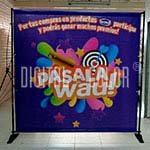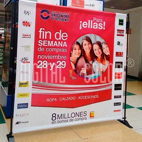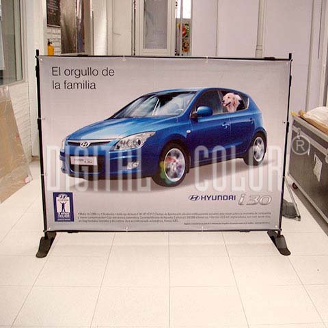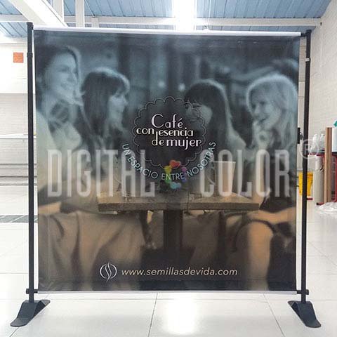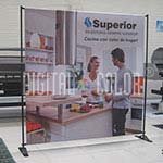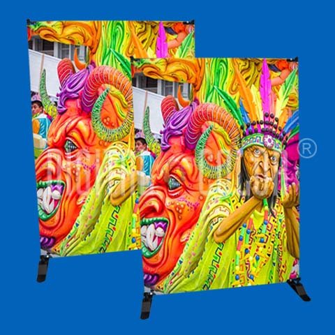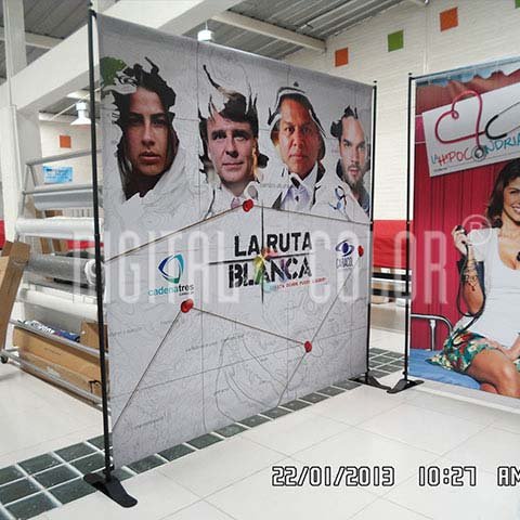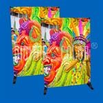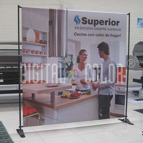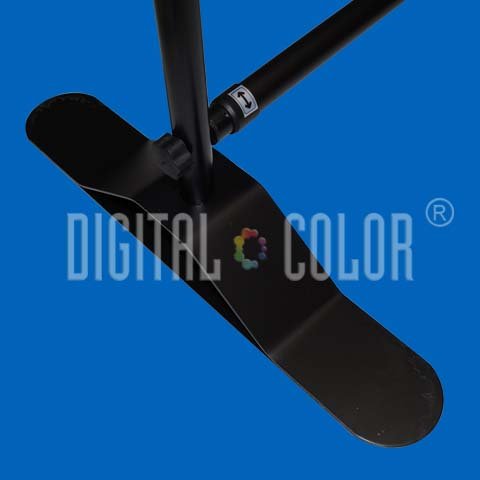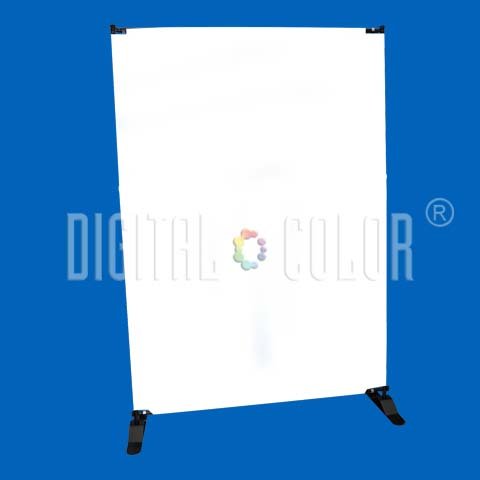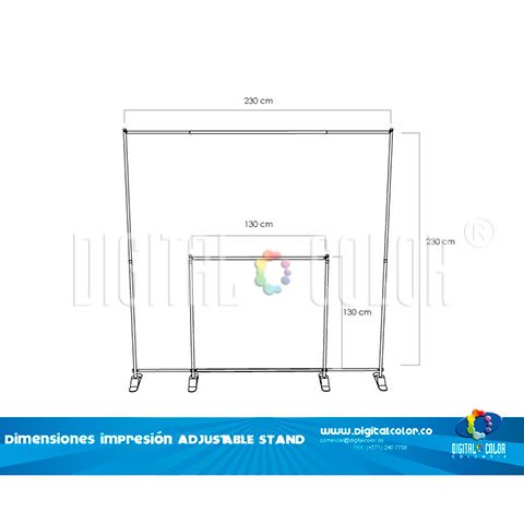 Adjustable Stand Es una pared formada por un marco, que permite ajustar el tamaño tanto de largo como de alto por sus postes en aluminio que se expanden telescópicamente para tensar su imagen, su base son dos patas en metal que se atornillan al marco para mejor estabilidad, muy fácil de montar, es altamente portátil cuentan con maleta de lona para su transporte.